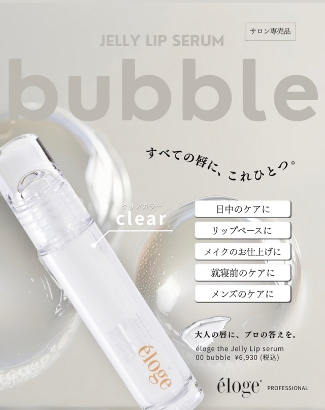 4/3 新発売 [サロン専売品] éloge the Jelly Lip serum 00 bubble ¥6,930(税込) すべての唇に、これひとつ。 【念願のラメなしクリアカラー登場♡】 日中のケアに リップベースにメイクのお仕上げに就寝前のケアに メンズのケアに